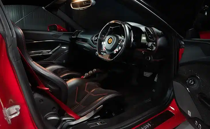 The Ferrari 488's interior features sport seats designed for superior support during high-speed driving, with extensive adjustability to accommodate drivers of varying sizes for optimal comfort. The cabin is crafted with premium materials, including leather-wrapped dashboard, steering wheel, and door panels, complemented by seats in a blend of leather and Alcantara, with carbon fiber accents. It also includes a cutting-edge infotainment system with a large touchscreen display, Bluetooth connectivity, and a premium sound system.
