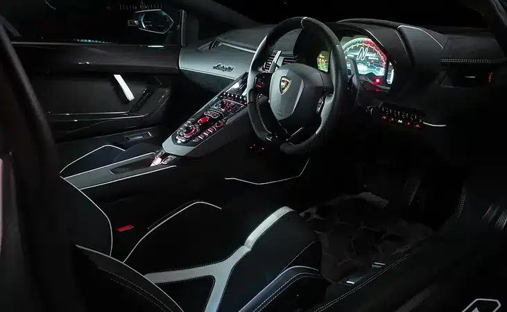 The Lamborghini Aventador SVJ's interior is crafted with premium leather and Alcantara upholstery, complemented by carbon fiber accents. The sporty, supportive seats are customized with a unique color selected by Saracen Cars. A digital instrument cluster dominates the dashboard, clearly displaying critical driving data such as speed, RPM, and gear selection. The infotainment system features a touchscreen display, seamlessly controlling audio, navigation, and climate functions.